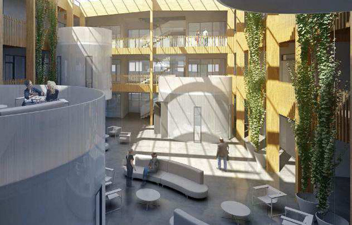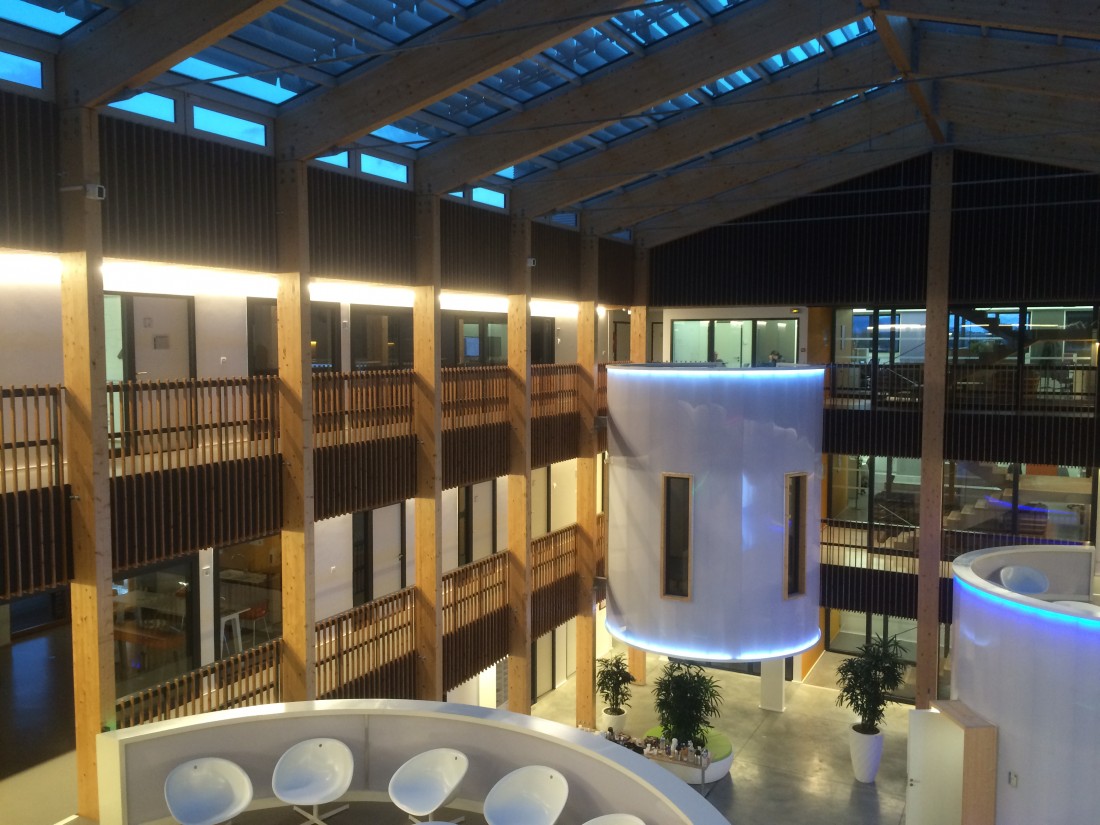 Le bâtiment se distingue par la création d’un large atrium, véritable espace de rencontres, comprenant des espaces de réunions informelles totalement atypiques. Ce volume central autour duquel rayonnent les espaces de travail fonctionne comme un véritable poumon climatique, régulateur des ambiances à l’intérieur du bâtiment.