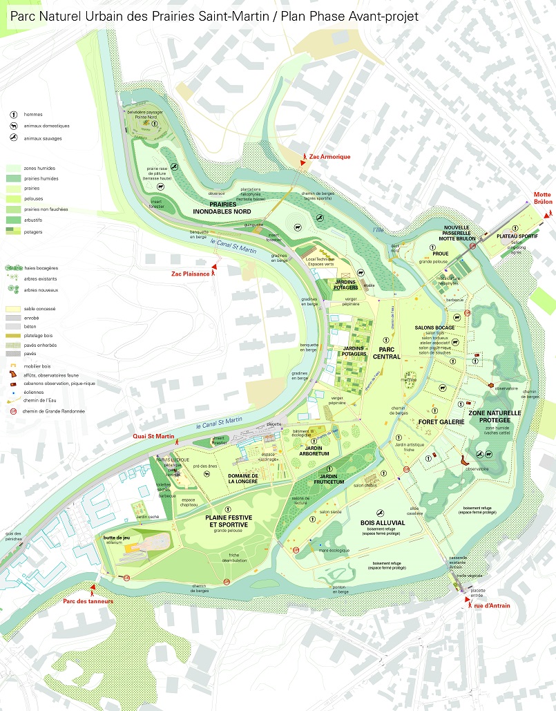 - entre parc public et zones écologiques : le long du canal, les prairies seront pensées comme un véritable parc public, avec un accès facile. Vers l’est, le site sera inondable et le parcours moins aisé. Il sera mis en place une mosaïque d’habitats écologiques notamment de milieux humides : étendues d’eau, roselières, prairies humides…